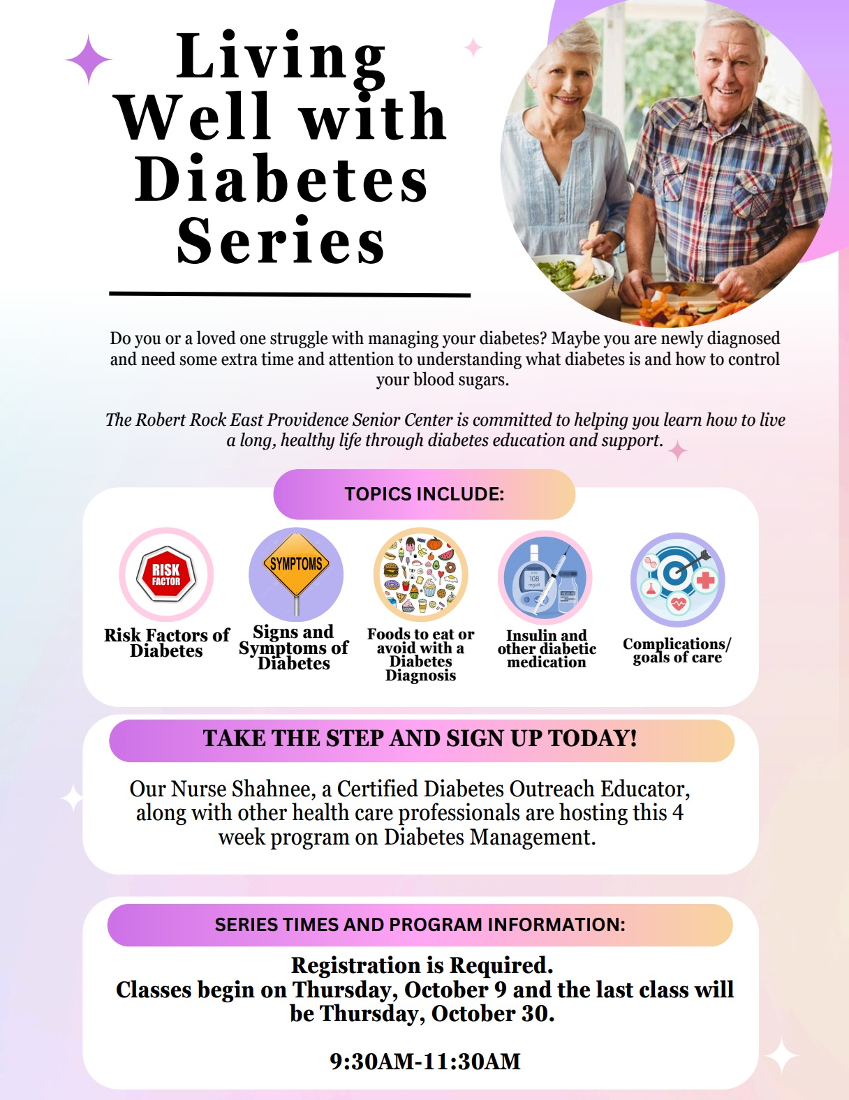 The Robert Rock Senior Center is committed to helping you learn how to live a long, healthy life through Diabetes education and support.