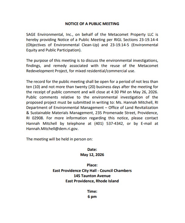 SAGE Environmental, Inc., on behalf of the Metacomet Property LLC is hereby providing Notice of a Public Meeting per RIGL Sections 23-19.14-4 (Objectives of Environmental Clean-Up) and 23-19.14-5 (Environmental Equity and Public Participation).