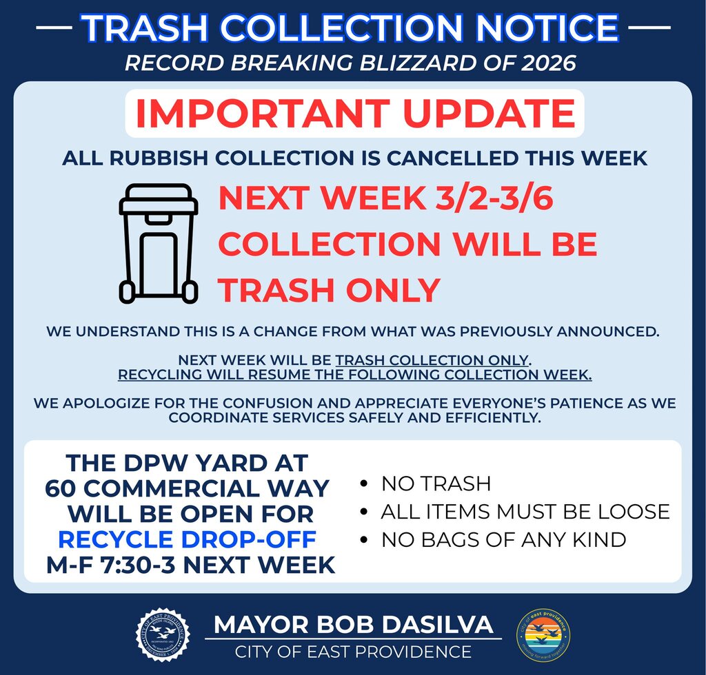 EAST PROVIDENCE, RI – The City of East Providence Dept. of Public Works has announced that due to the Blizzard of 2026, and a scheduling conflict with the City’s rubbish collection vendor, MEGA, there will be no recycling collection the week of March 2nd through March 6th.